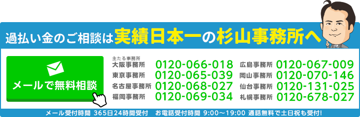 杉山事務所は相談者様のご負担を少しでも減らして、より多くのご相談を解決できるように、過払い金請求の相談料や着手金は一切いただいておりません。また、費用は取り戻した過払い金の中からお支払いいただけます。